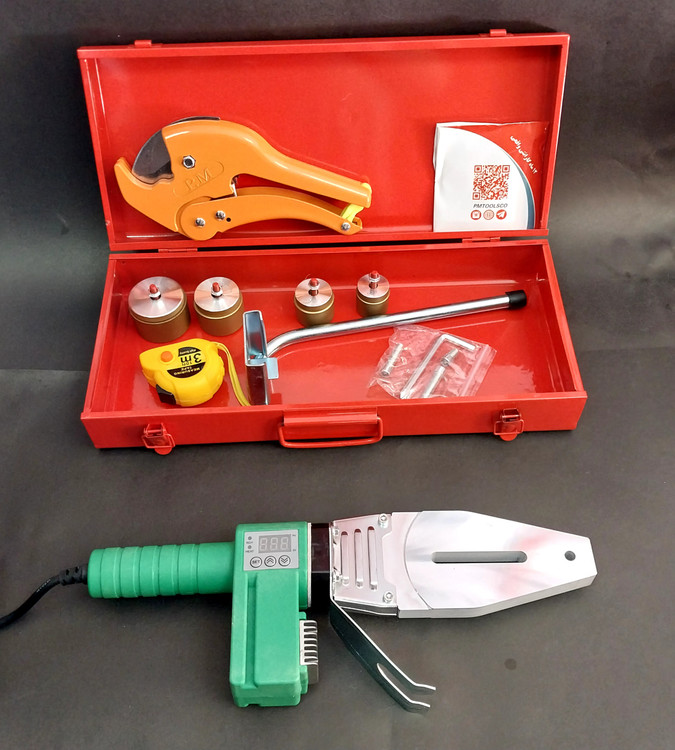 اتو لوله 2000 وات گوشه زن دیجیتالی پی ام انکور دارای سیستم تنظیم حرارت دیجیتال/دارای راکت مخصوص گوشه زن/دارای 4 لقمه در سایزهای 20 و 25 و 32 و 40 میلیمتر/دارای یک عدد قیچی حرفه ای و متر و جعبه فلزی